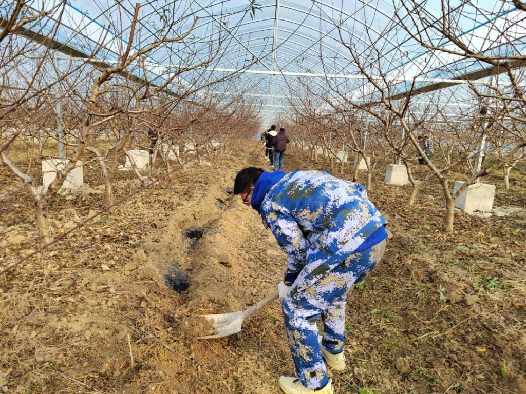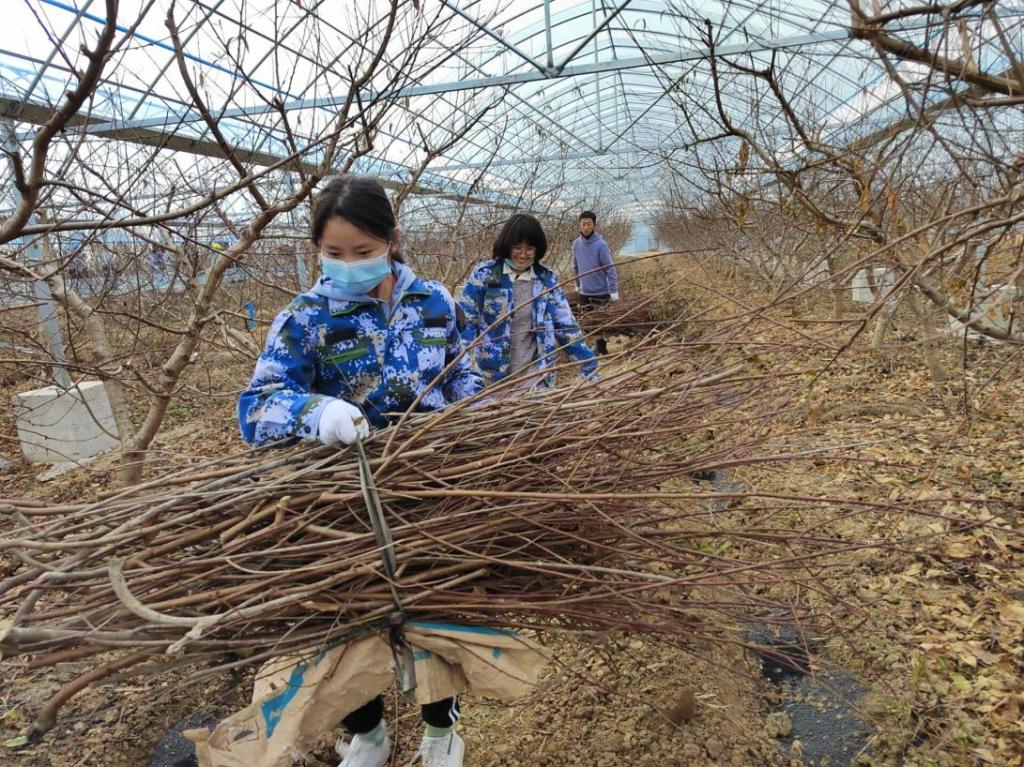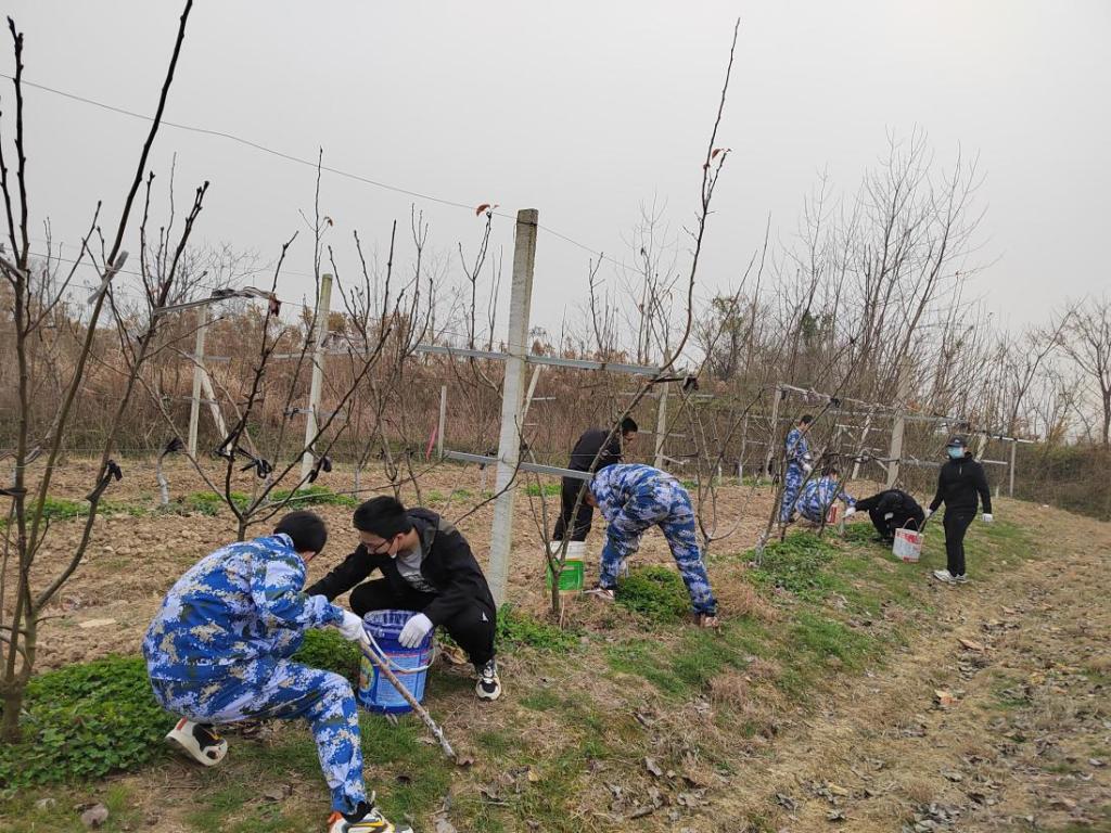 在农场,同学们在农场劳动教育实践指导老师的带领下走进果树和葡萄种植基地,了解种植与养护的相关知识。同学分组劳动,有的负责整理散装枝杈、有的负责沟渠开挖和果树施肥、有的负责给果树刷石灰水、有的负责葡萄藤压枝……在劳动中,同学们学习农业劳动技能,学会分工与合作。田间劳动的同学们很快就汗流浃背,虽然很辛苦,但脸上都洋溢着青春灿烂的笑容。