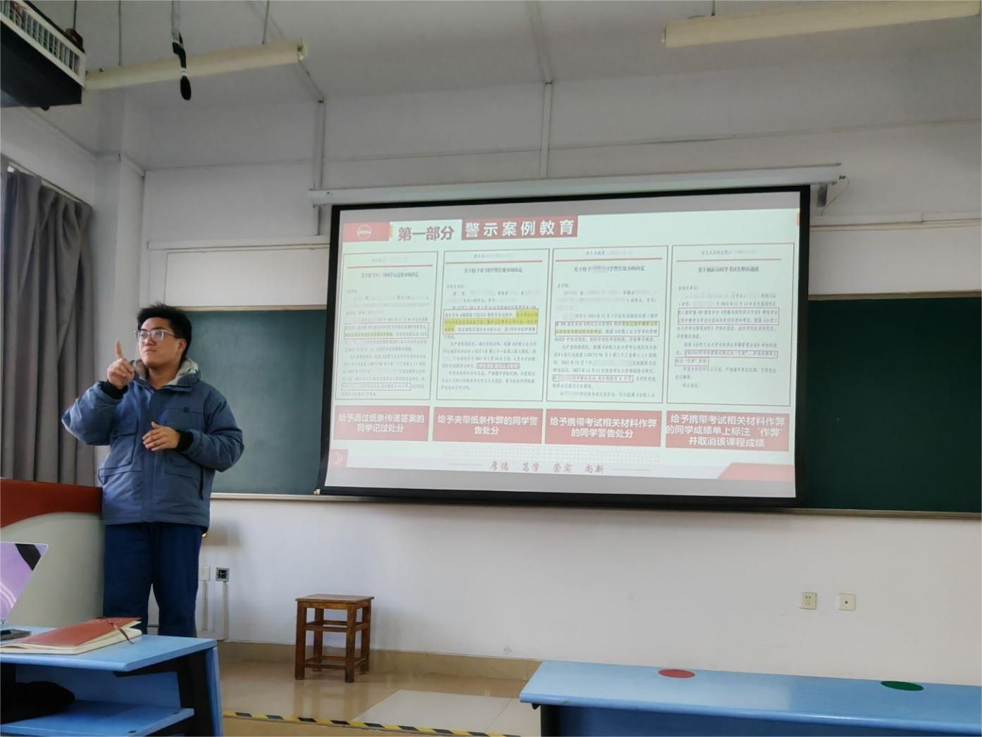 张浩男深入解读了《合肥工业大学考试管理细则》和《合肥工业大学学生违纪处分办法》,重点通过真实的案例,严肃告知学生作弊带来的不良后果,借此引导学生不断端正学习态度,踏实复习,以饱满的热情和进取的精神认真准备迎战期末考试。此外,还通过集体宣誓、签订《诚信考试承诺书》的方式,全面覆盖地引导学生交出合格的试题答案的同时,也交出完美的诚信答卷。