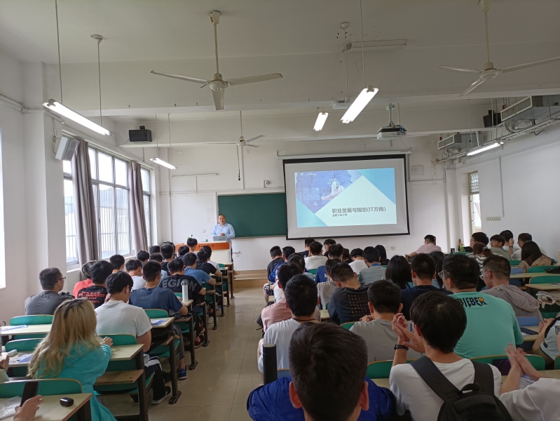 5月14日下午,B体育手机官方网站入口“数梦蓝图”就业指导讲座在翡翠湖校区举行。平安产险安徽分公司人事经理孔凡荣和DXCtechnology 产品研发部于鹏来校与学院2018级本科生交流。