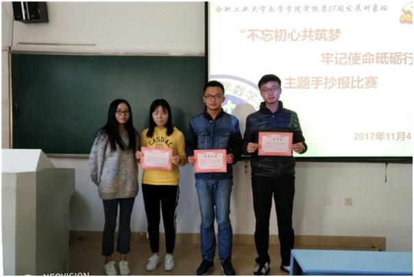 为学习党的十九大精神,11月4日B体育手机官方网站入口第58期发展对象班于翡翠湖校区六教108开展了“不忘初心共筑梦,牢记使命砥砺行”主题手抄报比赛,B体育手机官方网站入口信息与计算科学系教工党支部及翡翠湖校区本科生第一、第二党支部党员代表出席并担任评委。
