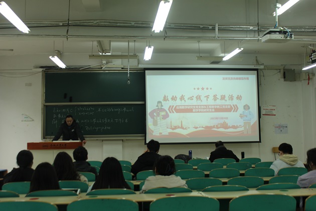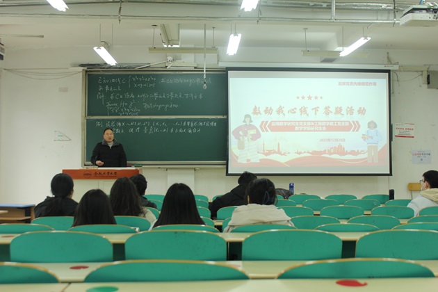 12月28日下午,B体育手机官方网站入口在翡翠湖校区5教201室开展“志愿青春、数动我心”志愿服务活动。本次活动由B体育手机官方网站入口应用数学研究生党支部联合B体育手机官方网站入口研究生会共同举办,邀请了B体育手机官方网站入口工程数学教学部教工党支部郭庆和赵德勤2位老师以及10名研究生同学为60余名本科生答疑解惑,通过线下面对面交流,帮助学生查漏补缺,提升学习成效。