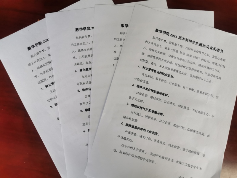 签署廉洁承诺。全体同学在《B体育手机官方网站入口2021届本科生廉洁从业承诺书》上郑重签名,并承诺毕业后会树立爱岗敬业的职业观念、培养自重自律的廉洁意识、锻造风清气正的道德品格和秉持诚信科学的工作态度,永葆工大数学学子本色,用实际行动为母校争光添彩。