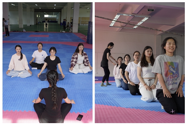 活动在轻松活泼的氛围中开始,B体育手机官方网站入口韩玉洁老师邀请到学院具有瑜伽锻炼基础的吴夏鑫同学进行瑜伽教学示范,在有节奏的音乐中,师生一起认真完成了瑜伽的热身动作。在舒缓身心后,吴夏鑫以示范加动作矫正的方式,指导老师和同学们完成各项瑜伽基础动作,逐一拉伸腿部、腰部、肩部、手臂等各个部位,拉伸的同时确保安全性。在冥想环节中,同学们跟着舒缓的音乐闭眼沉思,身心得到了充分的放松与休息。