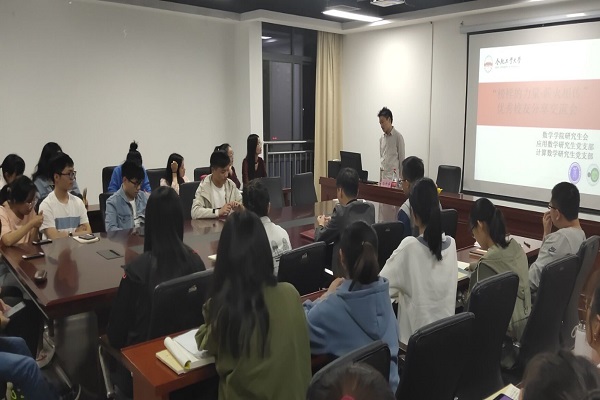 为促进低年级研究生明确自己在未来的研究生学习中的方向,做好研究生生涯规划,10月26日晚8点,B体育手机官方网站入口研究生会、应用数学研究生党支部和计算数学研究生党支部在翡翠科教楼1710举行了“榜样的力量,薪火相传”——优秀校友分享交流会,本次交流会邀请到了毕业于B体育手机官方网站入口16级博士孙中华主讲,B体育手机官方网站入口研究生会主席朱娅婷主持。