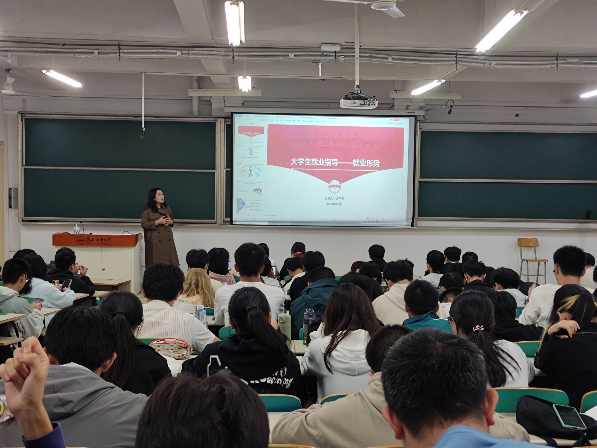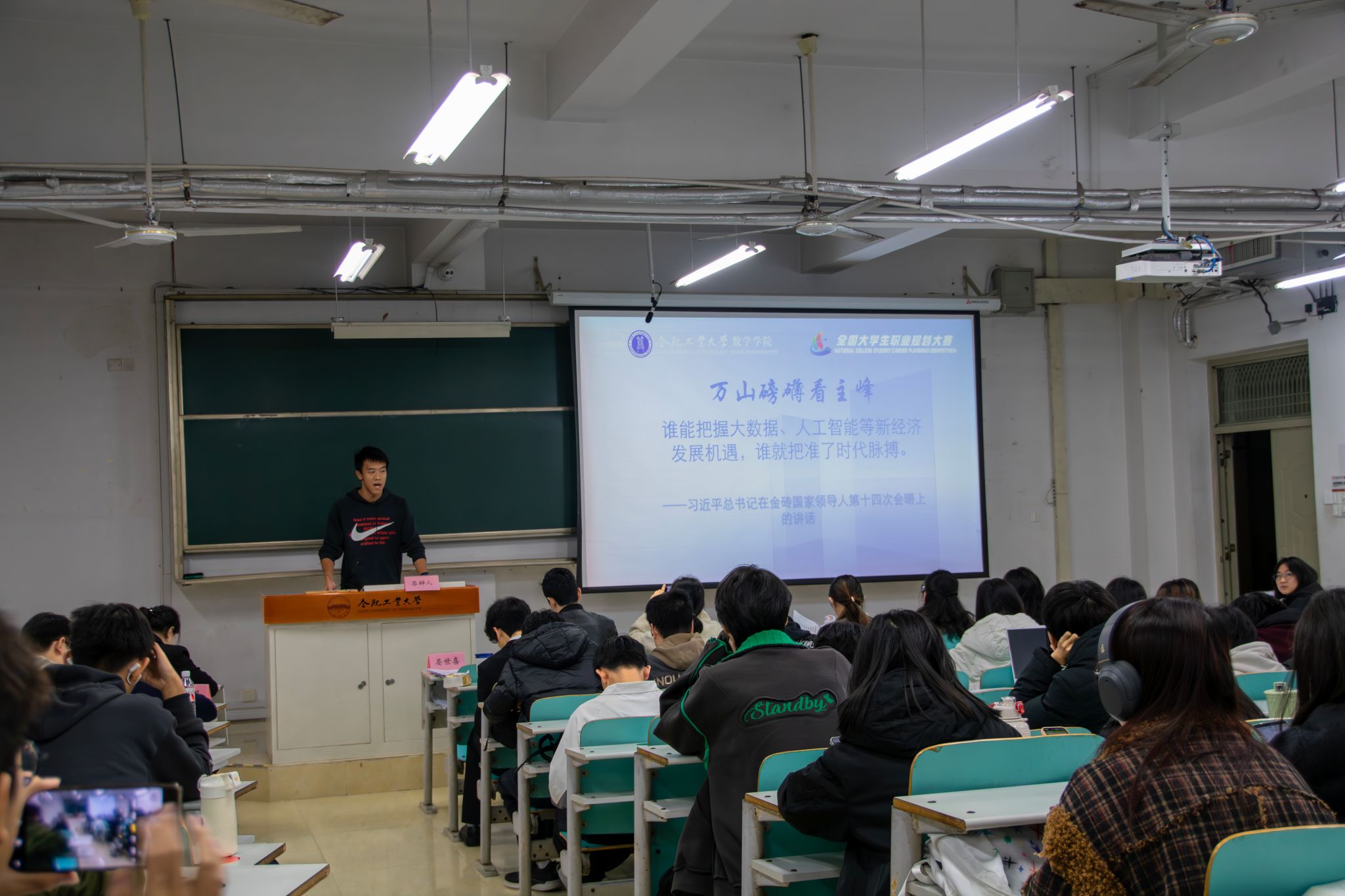 2024年11月15日,B体育手机官方网站入口第二届大学生职业规划大赛动员大会在一教202举行,2024级本科生辅导员韩玉洁老师围绕赛事的意义、规则介绍、赛道解读、前期准备等方面对赛事准备工作开展辅导,并以数学专业为中心,为同学们提供了一些职业规划路径。此次大会学院还邀请了首届职业规划大赛全国总决赛金奖获得者许晋嘉作专题辅导报告。许晋嘉同学围绕PPT制作、答辩技巧等环节,向学弟学妹们分享了自己的备赛经验,同学们纷纷踊跃提问发言,现场气氛热烈。动员大会同时邀请2024级硕士新生许芊蔚同学为同学们分享简历制作与个人规划方案的撰写培训。
